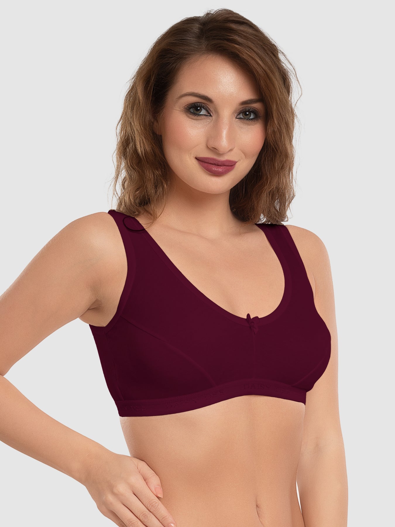 Stay supported, confident, and comfortable through every move with this pack of 2 Daisy Dee full-coverage sports bra. Designed for your active lifestyle, these bras offer a perfect blend of support, breathability, and ease making them ideal for daily workouts or all-day wear. Crafted from soft, stretchable cotton fabric, each bra features wide, smooth straps that reduce shoulder pressure and provide steady support during exercise. The wire-free, non-padded design feels naturally light while still offering excellent shape and hold. The U-shaped neckline at the front and back adds flexibility, stability, and a flattering look. With their slip-on style and no-dig straps, these bra make getting ready quick and comfortable. Perfect for activities like gym exercise, workouts, fitness training, yoga, jogging, walking, and even daily activites these bras are your everyday active essential.